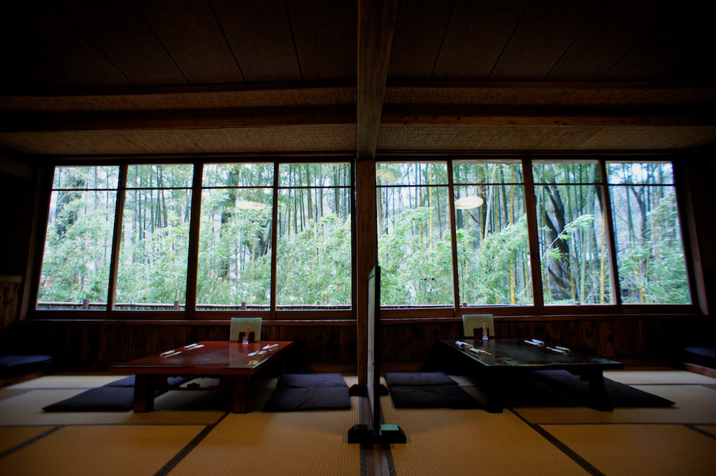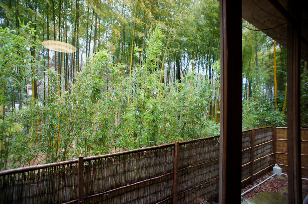古い旅館を改装したという佇まい。しつらえも実にいい感じで窓外にはサラサラとたなびく竹林。風雅ともいえるゆったりとした時間につつまれていて、とても心地よい空間。