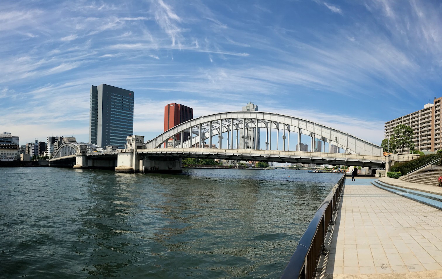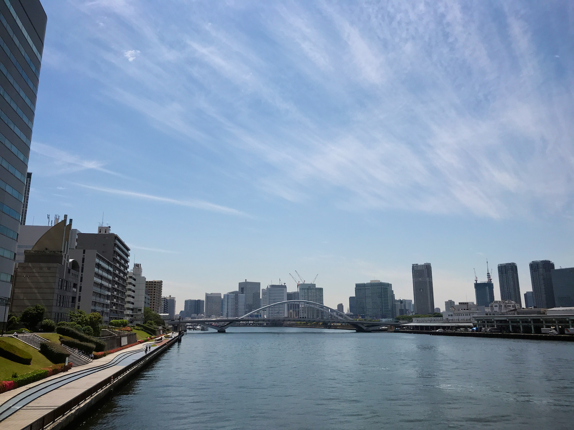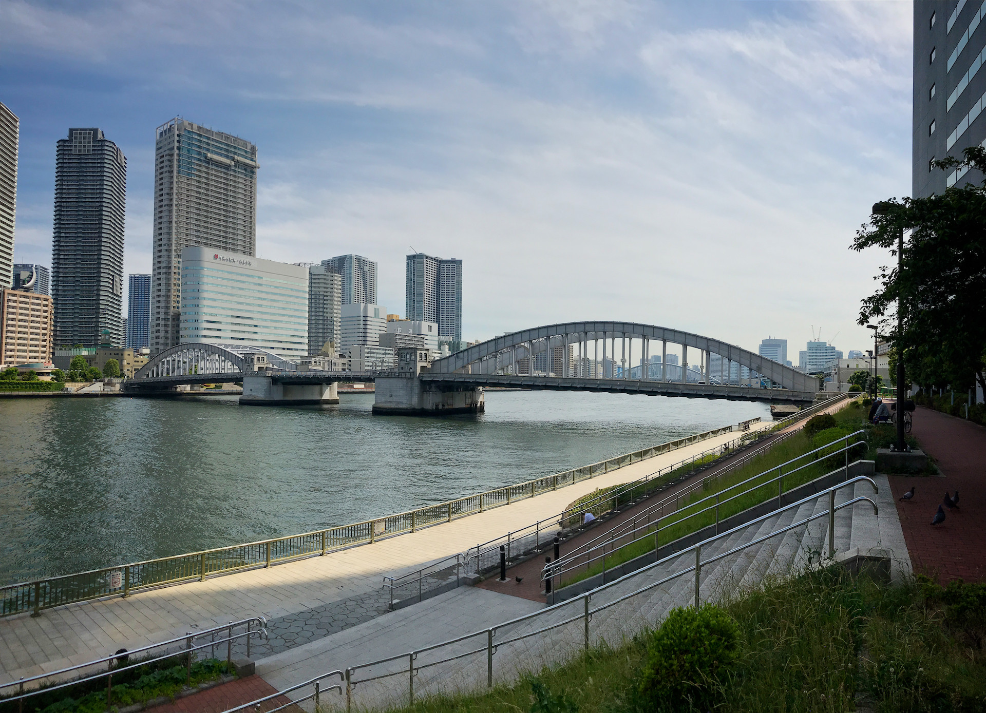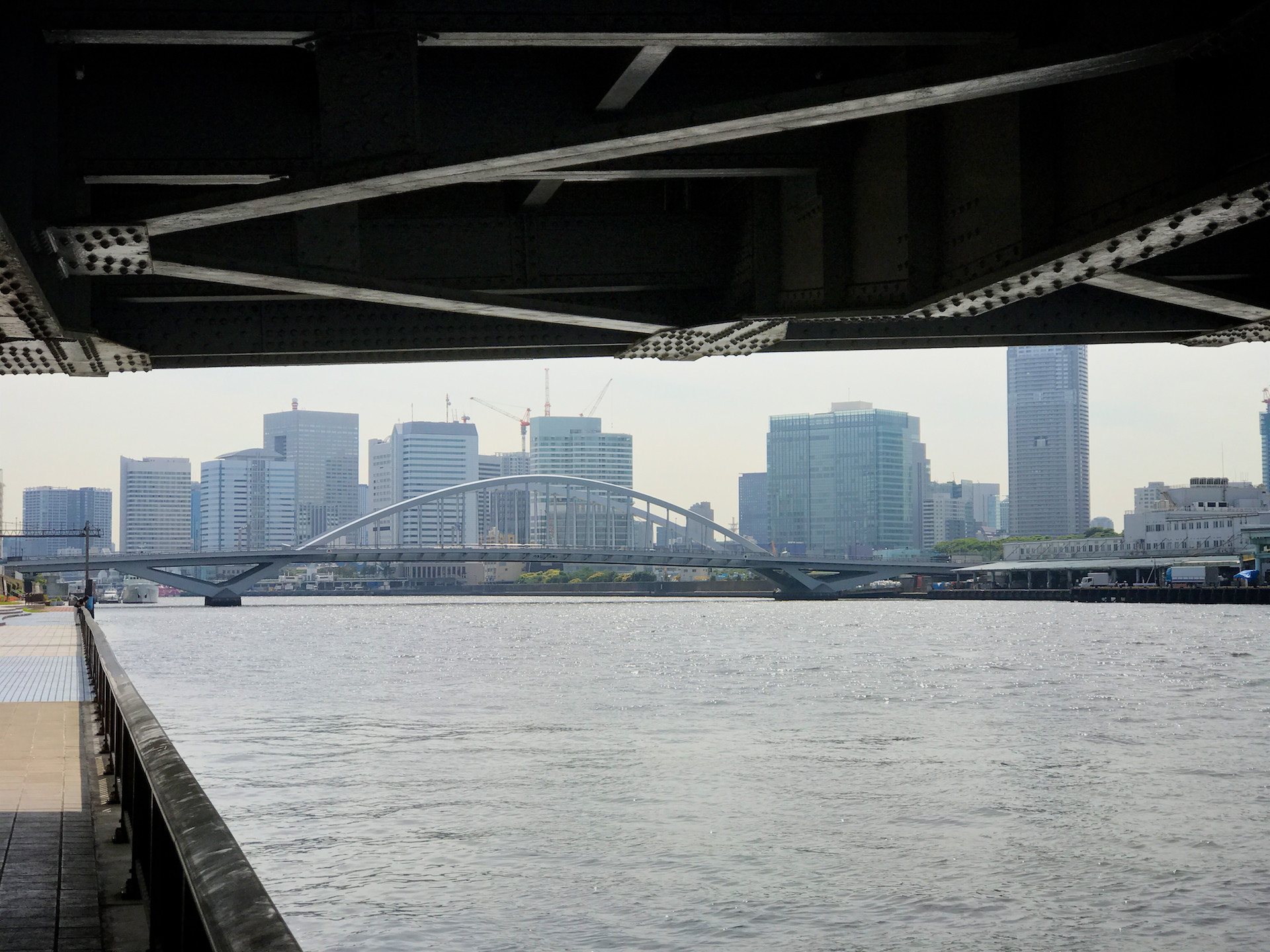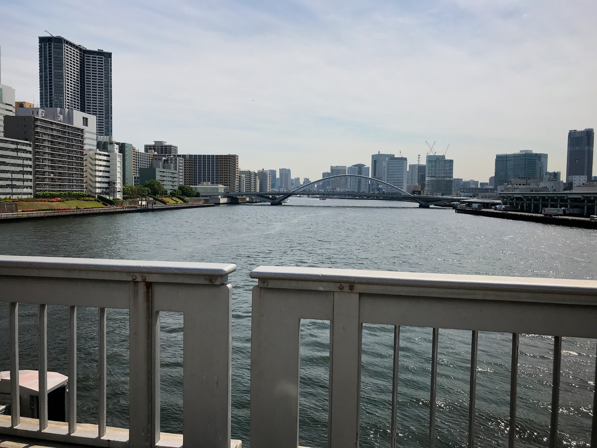 下流方面を眺めれば築地大橋が!美しい中路式アーチ橋。